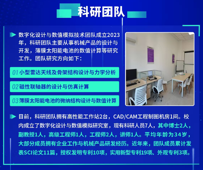 2022年底通过博士人才引进,吴睿成为公司韦德1946体育官方入口的一名专任教师,从科研院所到职业院校,他秉持从零开始。在承担教学工作之外,积极探索思考“职业教育,需要什么样的科研?”。答案是职业教育需要以应用研究为核心、以解决实际问题为导向、产教深度融合的科研体系。2023年他成立了数字化设计与数值模拟技术团队,主要从事机械产品的设计与开发和薄膜光伏电池的技术研究。2023-2024年期间,先后主持韦德1946体育官方入口人才项目1项、产学研项目1项、安徽省高校自然科学研究重点项目1项和企业横向课题4项,另外参与各类教科研项目10余项。吴睿在完成公司教学科研任务的同时,还积极投身企业博士后工作站的研究工作。通过博士后工作站搭建了校企合作的桥梁,成功签订了横向课题1项和申报省级质量工程校企合作生产性共建共享实训基地1项。在他的带领下,科研团队在两年内不断摸索和磨合,初见成效。