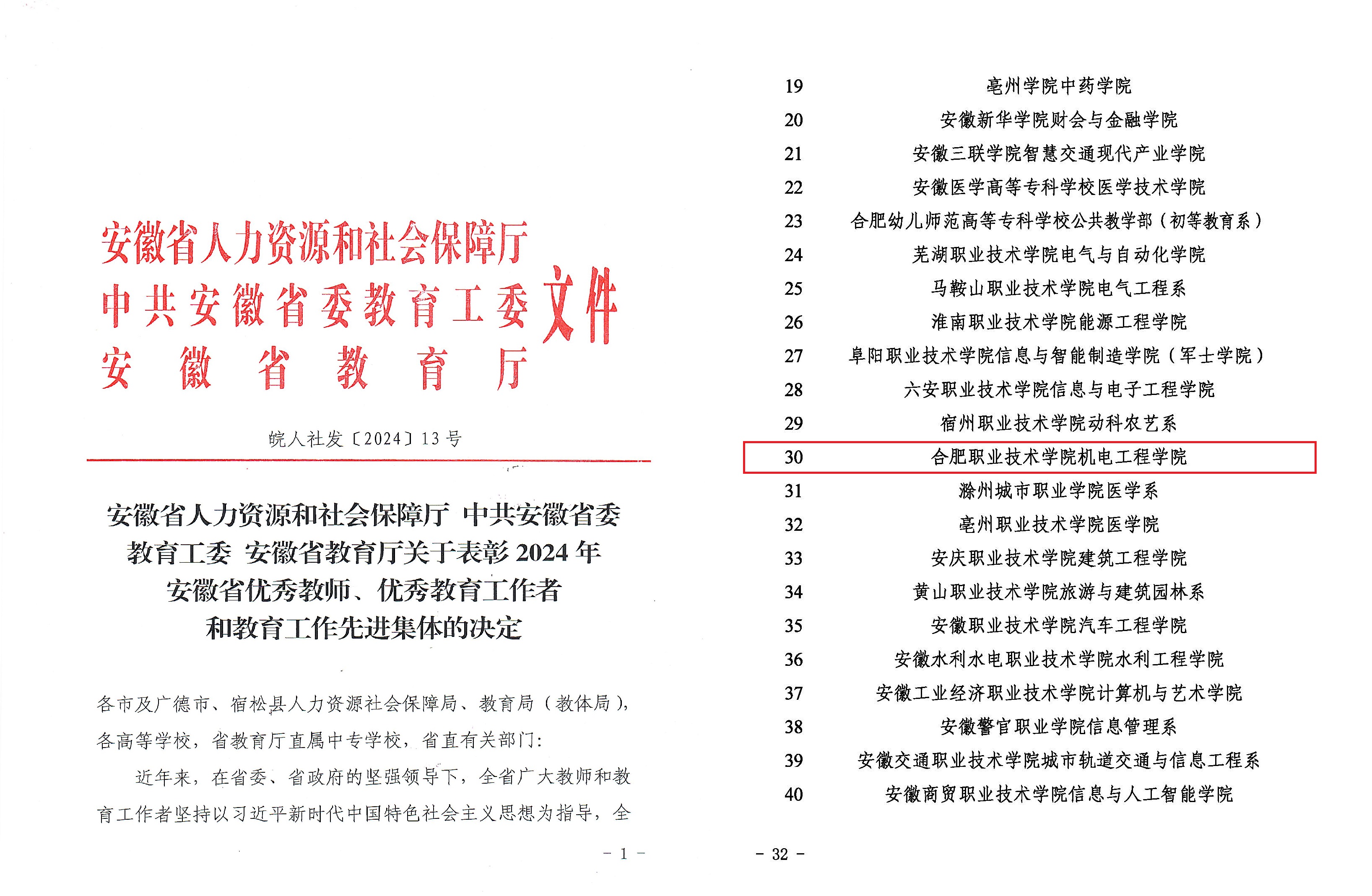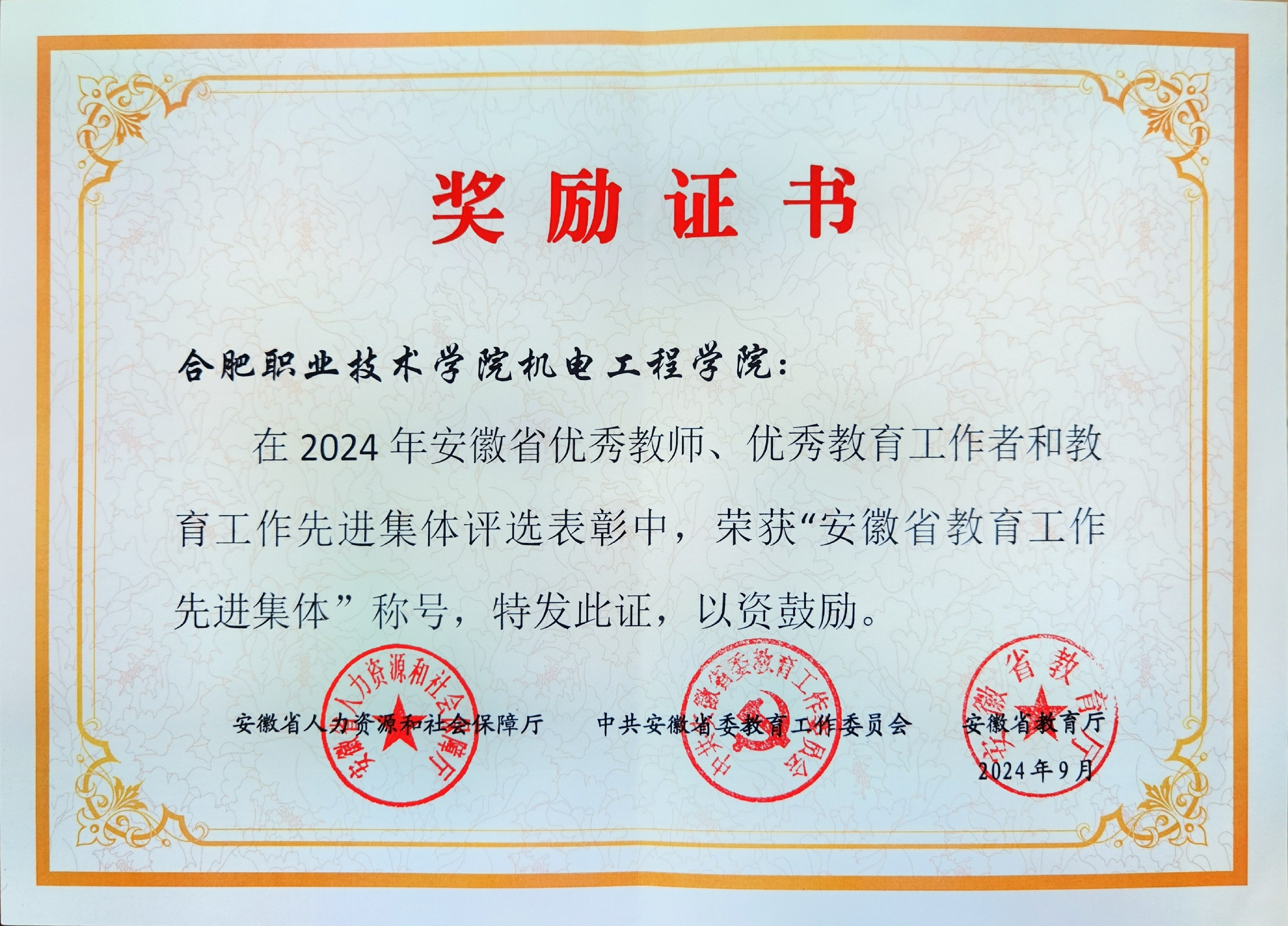 近日,安徽省人力资源和社会保障厅、中共安徽省委教育工委、安徽省教育厅发布了《关于表彰2024年安徽省优秀教师、优秀教育工作者和教育工作先进集体的决定》。韦德1946体育官方入口凭借其在公司产品、产教融合及人才培养等多个领域取得的成就,荣获了2024年“安徽省教育工作先进集体”荣誉称号。