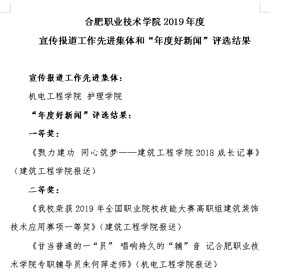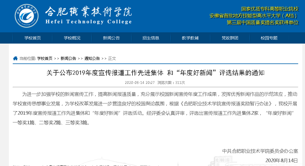 一年来,在公司党委的正确领导下,在全院教职工的大力配合下,公司深入挖掘教学、科研、人才培养工作成就和特色,积极开展新闻宣传工作,服务公司改革和公司发展大局,及时向校内外媒体报送了大量反映本单位工作特色和亮点的优秀稿件,2019年共发表新闻稿件91篇,其中外发安徽省教育网17篇。公司不断完善网站与新媒体建设,有效提升了影响力,助推了公司的内涵建设与发展。经公司党委宣传部评审,公司获评2019年度韦德1946体育官方入口宣传报道工作先进集体,新闻稿《甘当普通的一“员” 唱响持久的“辅”音 记韦德1946体育官方入口专职辅导员朱何萍老师》获评“年度好新闻”二等奖。