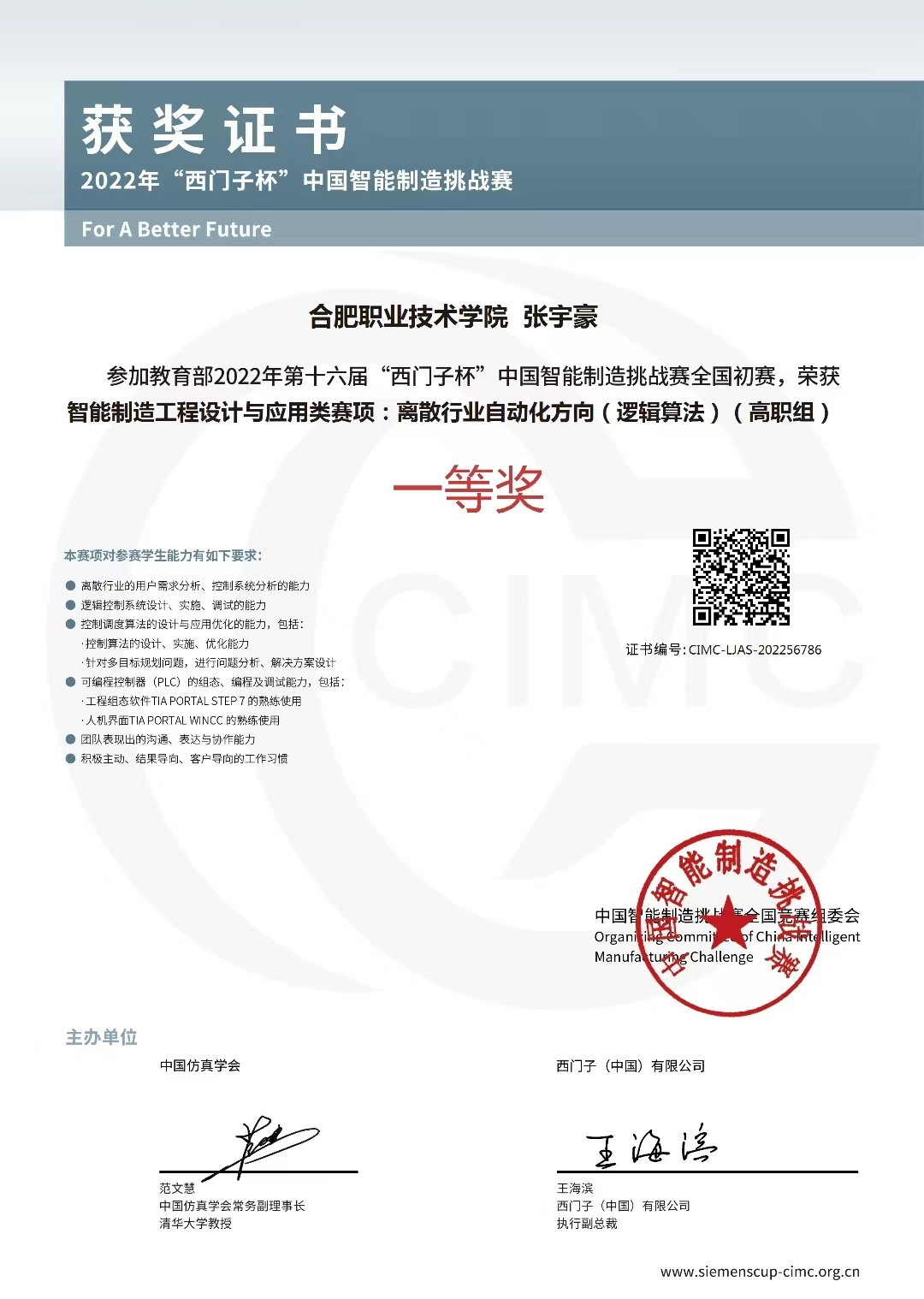 2022年9月3日-4日,第十六届“西门子杯”中国智能制造挑战赛华东三赛区暨全国初赛比赛顺利举行。公司韦德1946体育官方入口张宇豪、张子博、宁骏等三位同学在胡经纬、张君继两位老师的共同指导下,获得离散行业自动化(逻辑算法)赛项全国初赛一等奖。