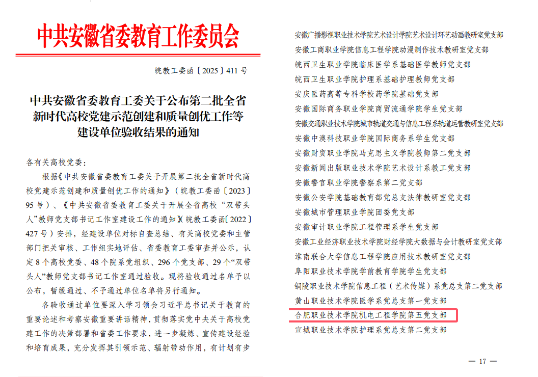 近日,根据《中共安徽省委教育工委关于公布第二批全省新时代高公司党建示范创建和质量创优工作等建设单位验收结果的通知》,公司第五党支部顺利通过第二批“全省高公司党建工作样板支部”验收。