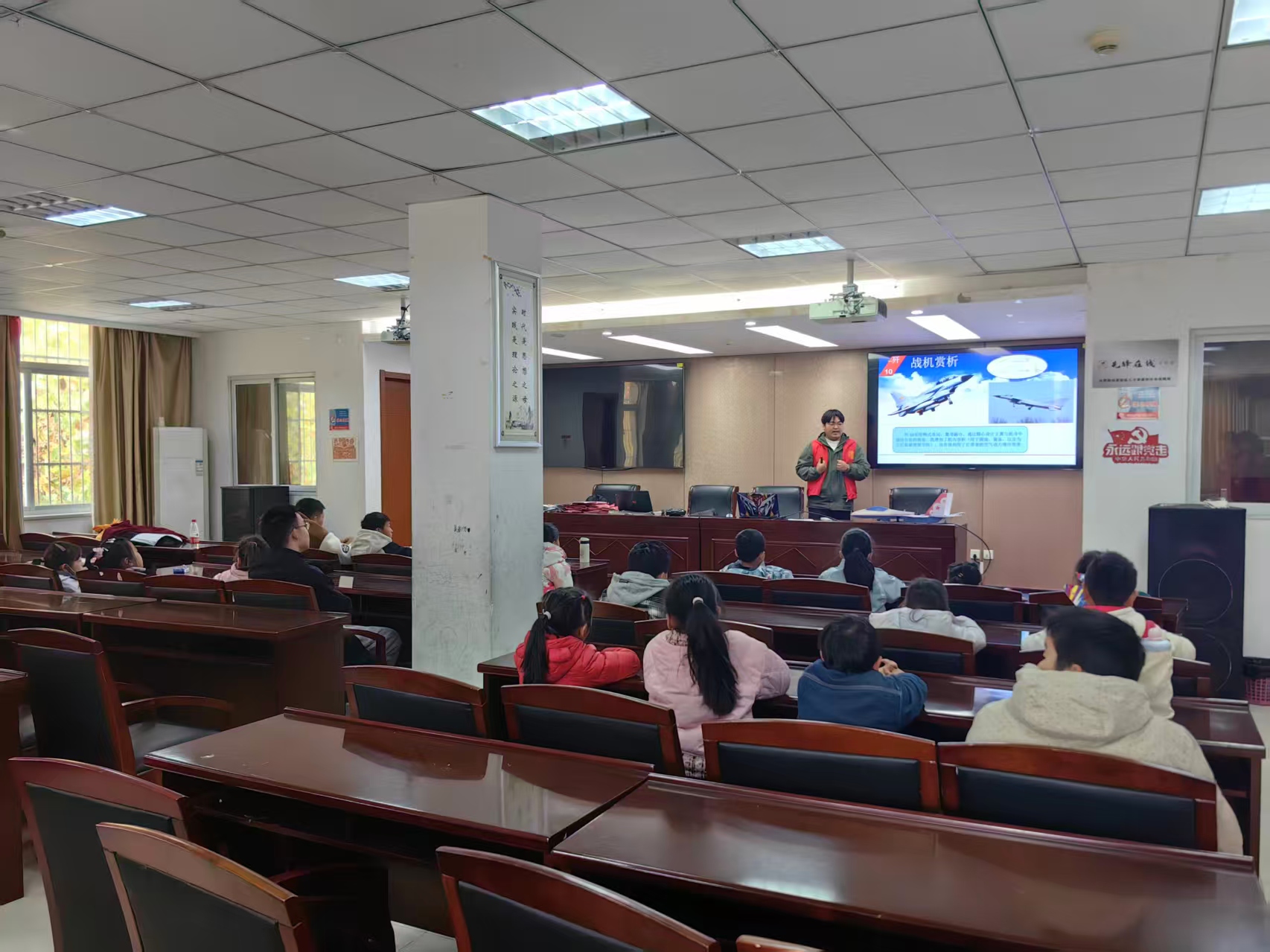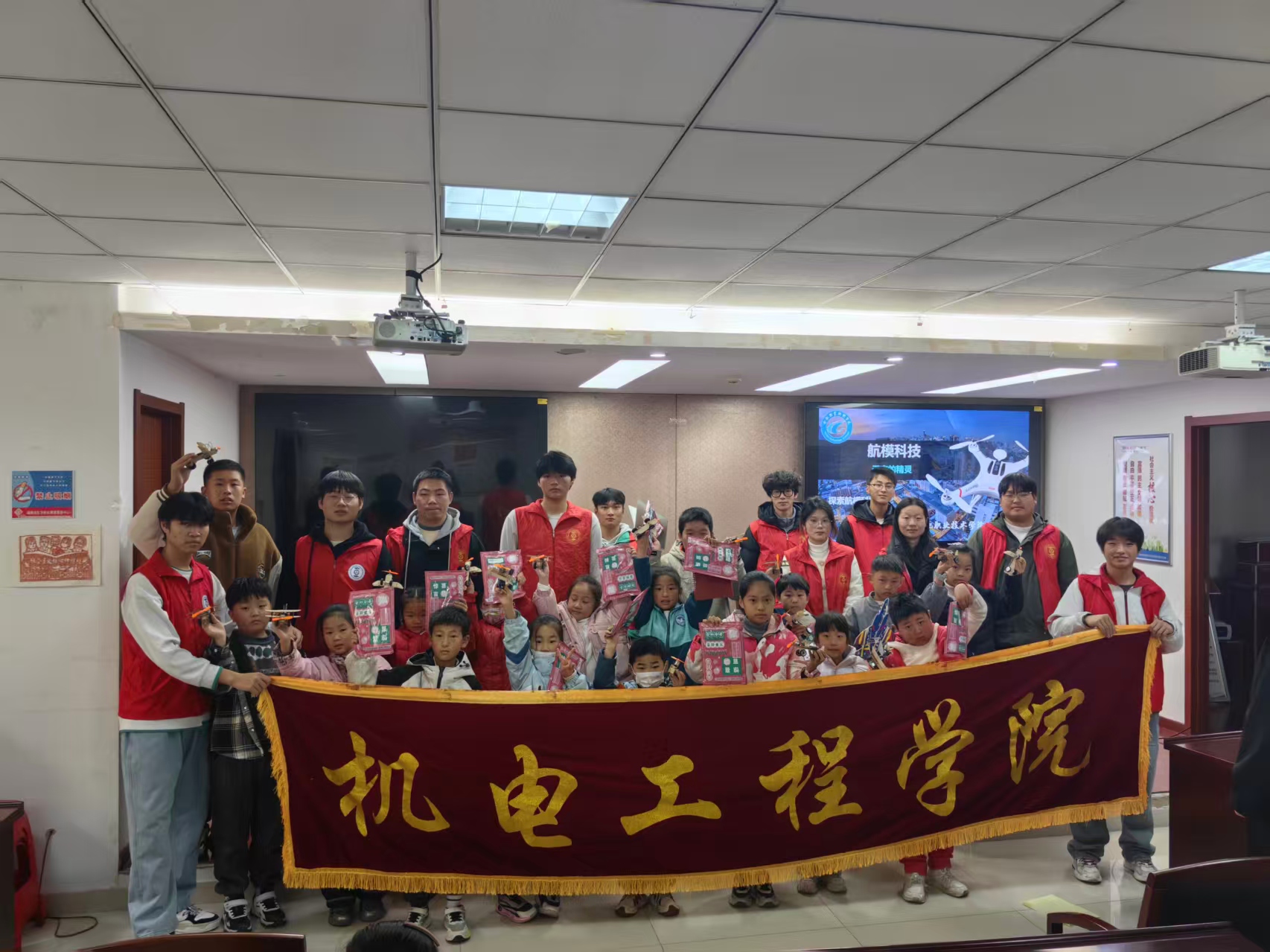 活动中,陈化伟同学以生动有趣的讲解,带领孩子们步入航模的奇妙世界。通过精彩视频与实物模型的展示,他从初代战机娓娓道来,一直讲述到现代隐形战机的演变历程,勾勒出一幅航空科技的壮阔图景。“大家知道飞机为什么能在天上飞吗?”“机翼的作用是什么?”他频频抛出问题,与孩子们热情互动。小朋友们积极举手、踊跃作答,现场气氛活跃而温馨。回答正确的孩子还获得了志愿者们精心准备的小奖品,一张张稚嫩的脸上绽放出灿烂的笑容。