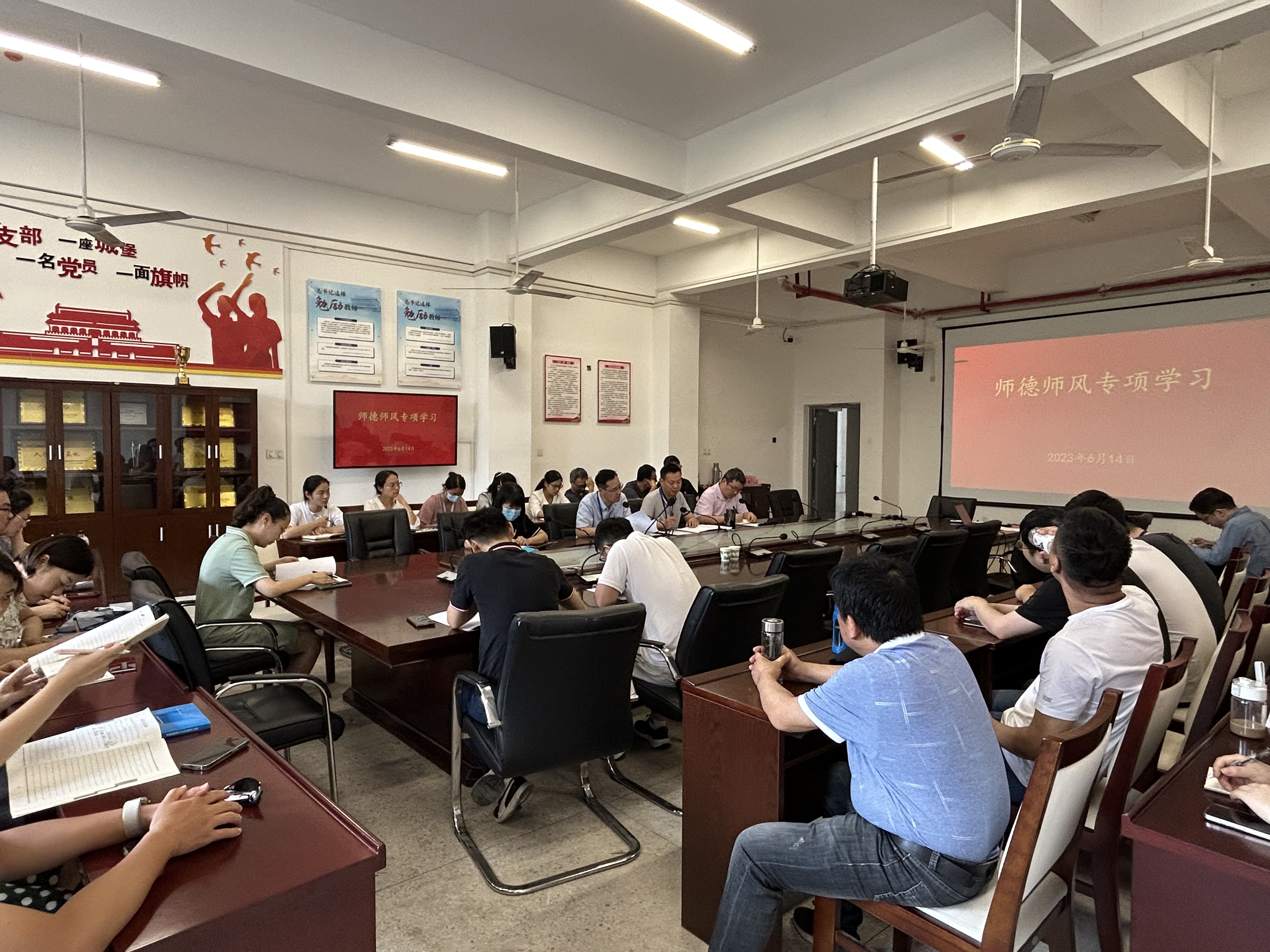 6月14日,韦德1946体育官方入口在机电楼二楼会议室召开六月份党员活动日暨师德师风专项学习活动,韦德1946体育官方入口全体教职工参会,会议由党总支副书记丁迎春主持。