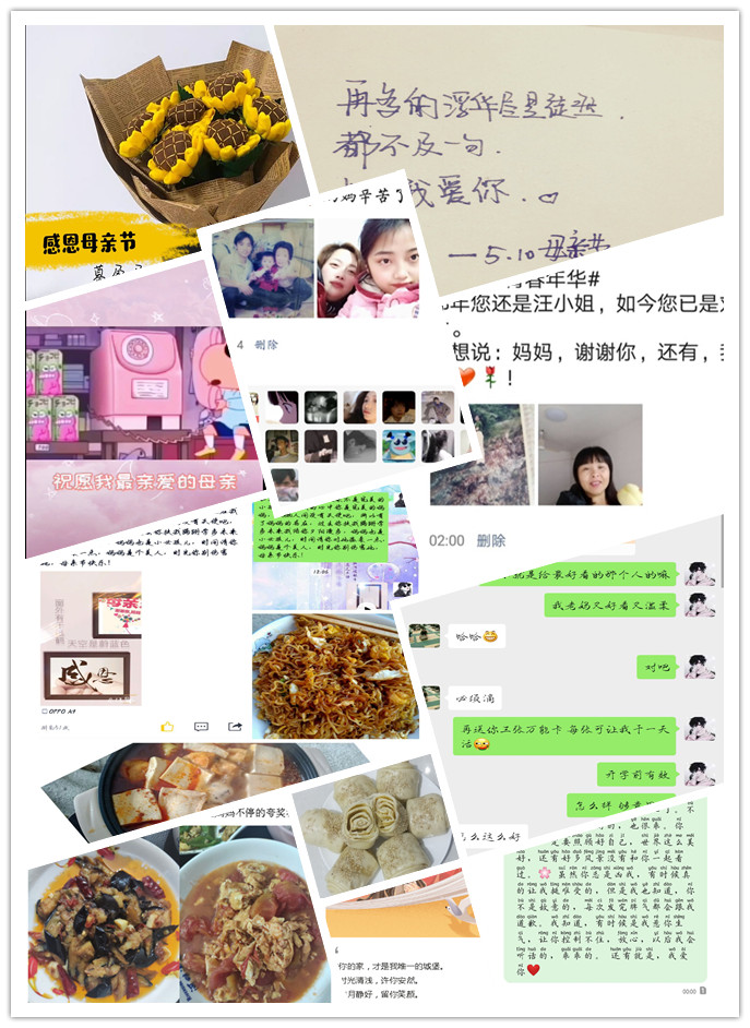 母亲节当天,同学们用不同的方式表达对母亲的爱,录制感恩视频、发送祝福短信、晒出母亲年轻时的照片、打一通亲情电话、为母亲做一顿可口的饭菜、赠送一件精致的礼物……