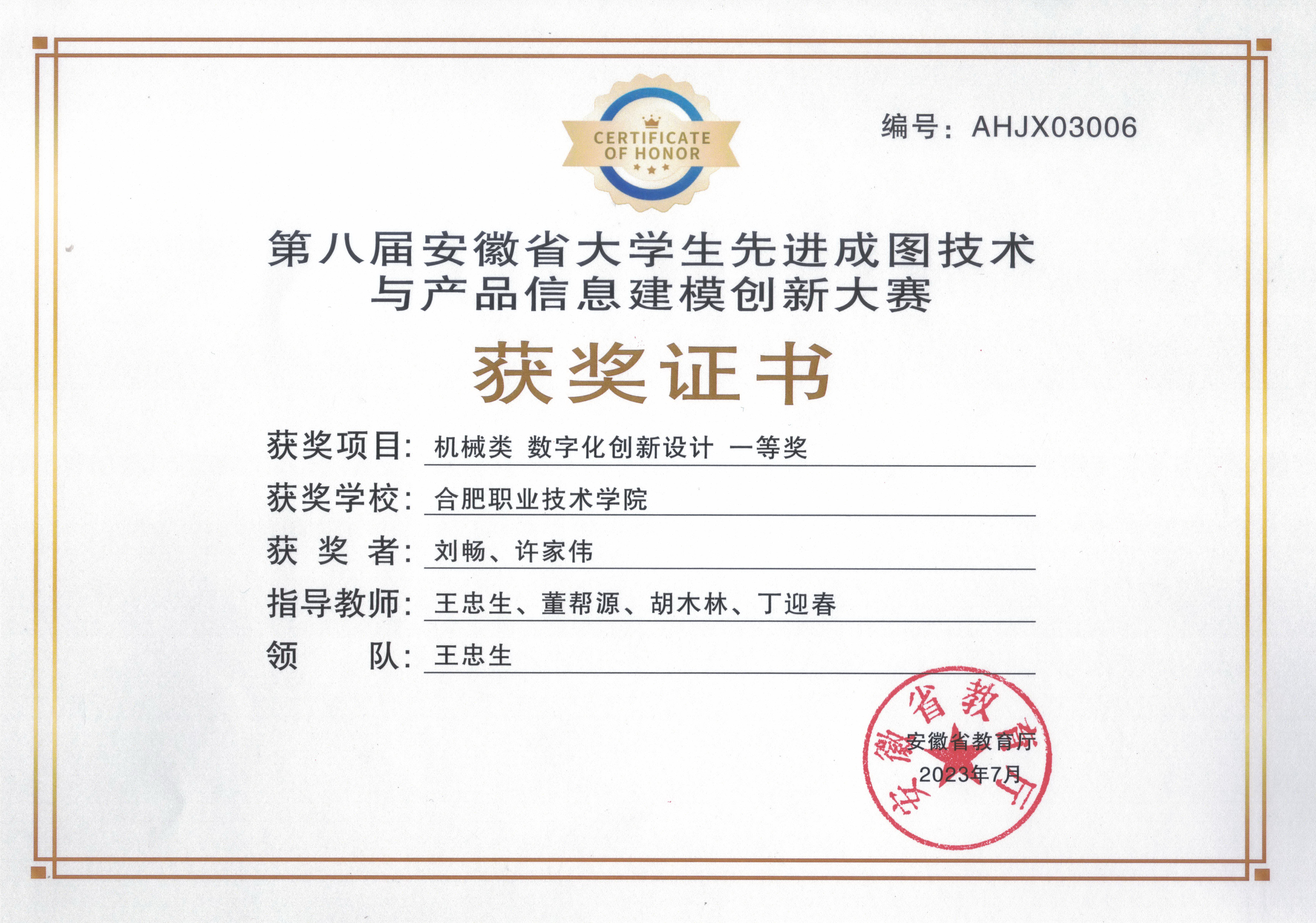 【专业建设成果】最近五年,机械设计与制造专业已建成省级精品课程5项,省级教科研项目36项。专业员工在全国技能大赛赛事中获得一等奖3项,二等奖2项,三等奖2项;在安徽省职业技能大赛等省级赛事中获得一等奖13项,三等奖4项。