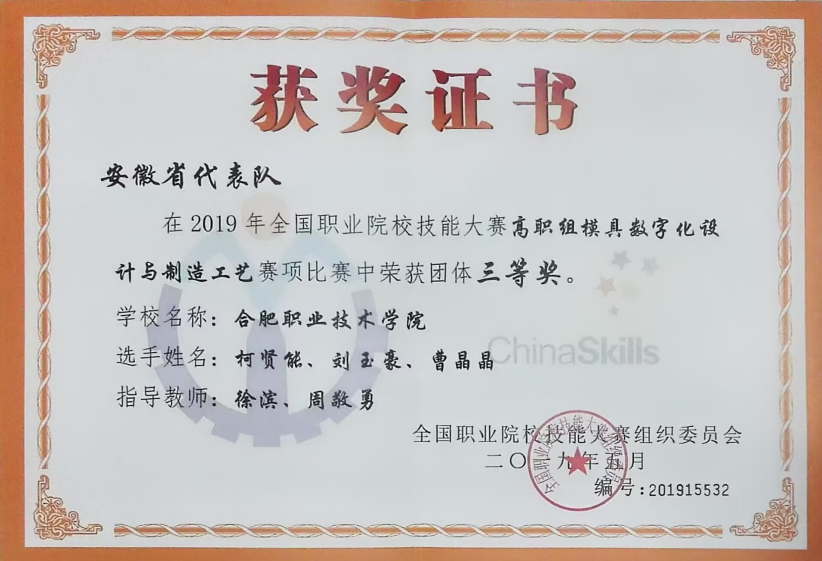 【专业建设成果】最近五年,模具设计与制造专业已建成省级精品课程4项,省级教科研项目30项。专业员工在全国技能大赛中获得一等奖1项,获得二等奖2项,三等奖1项;在安徽省职业技能大赛中获得一等奖6项,二等奖10项,三等奖10项。