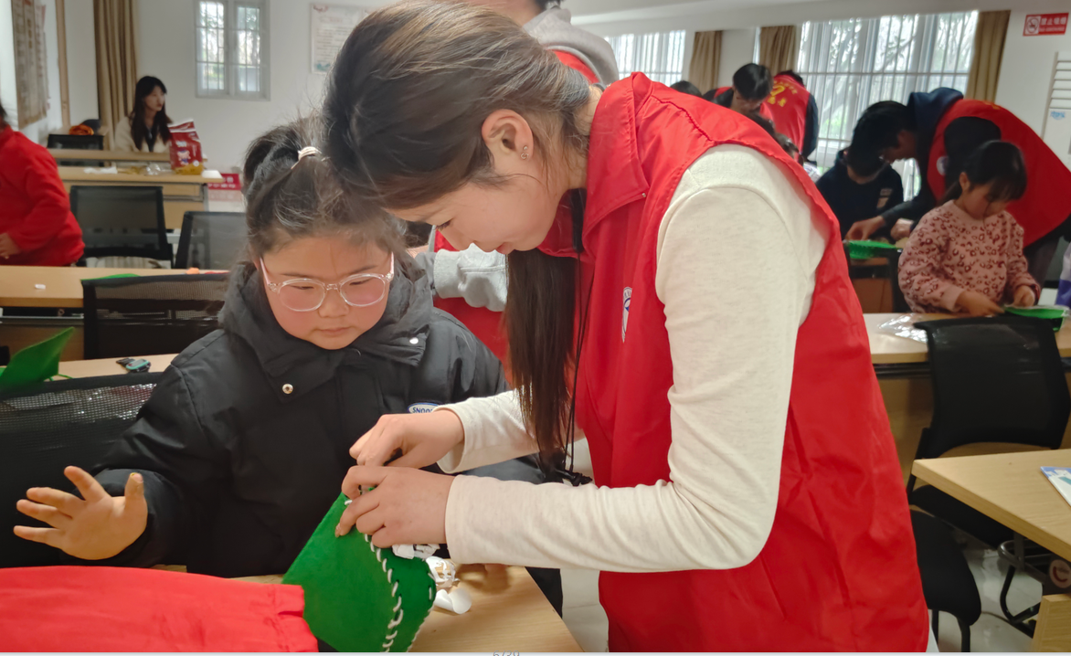 随后,志愿者带领孩子们用环保布料制作“雷锋爱心小包”。面对穿针、缝纫等精细步骤,志愿者们蹲坐在孩子身旁,逐一示范技巧。“线头要沾点水再穿针眼”、“缝边时针脚要像雷锋叔叔做事一样细致”。孩子们紧抿嘴唇,专注地模仿动作。经过半小时的努力,二十余个形态各异但满载心意的爱心小包逐一完成,孩子们激动地展示作品纷纷表示,“我要把零花钱装进去,效仿雷锋叔叔的精神,去帮助他人!”