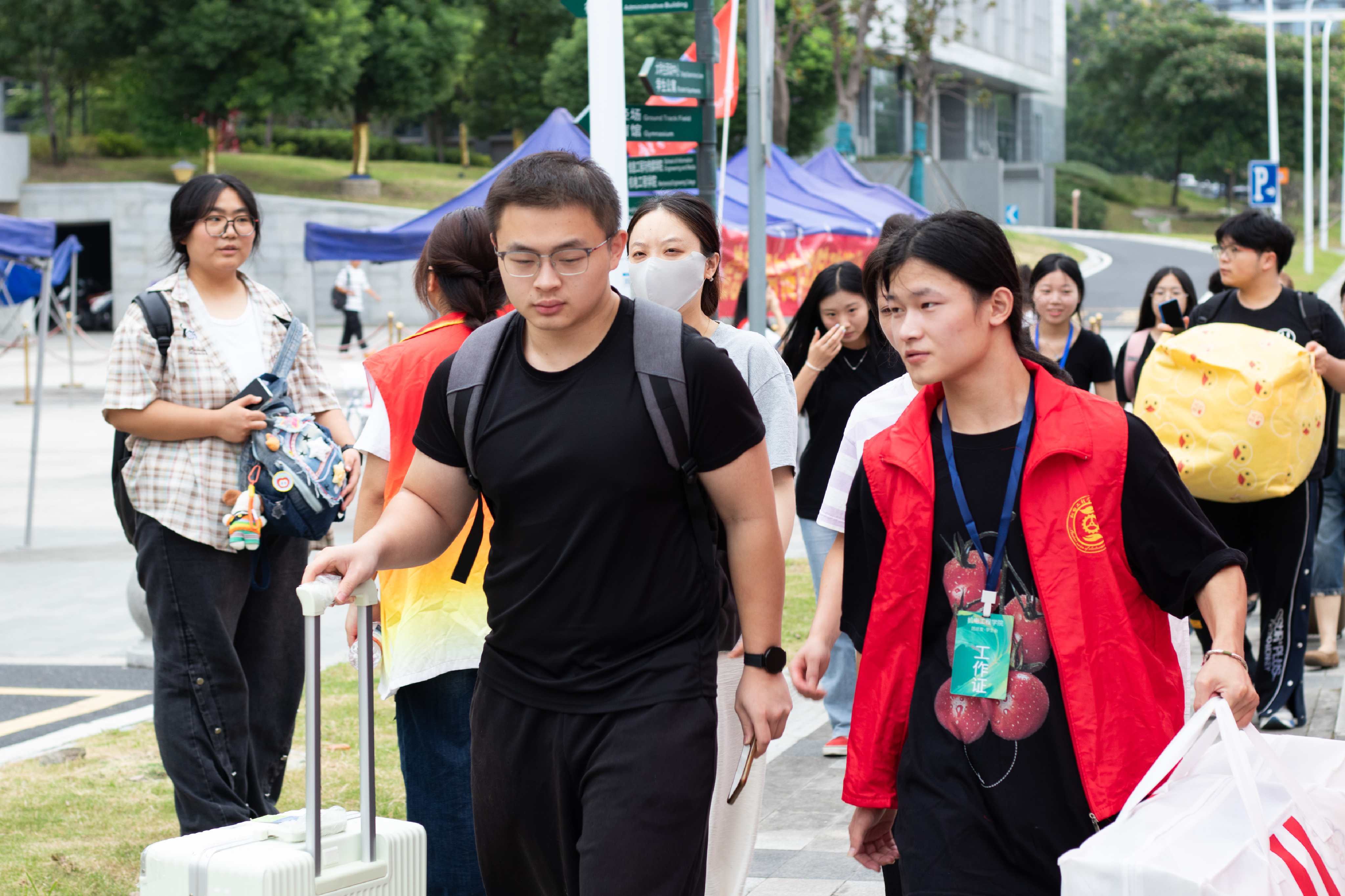 报到当天,校园内彩旗飘扬,欢迎横幅高挂,一派喜庆气氛。公司在校内主要路口和报到区域分别设置了引导志愿者,确保新生“一站式”完成所有入学手续。志愿者们身着统一服装,早早守候在岗位,主动帮助新生搬运行李,耐心解答疑问,引导他们办理各项手续。不少志愿者还担任“一对一”学长学姐向导,全程陪同新生熟悉校园环境,介绍教学楼、食堂、图书馆等场所,让初来乍到的同学迅速融入新环境。