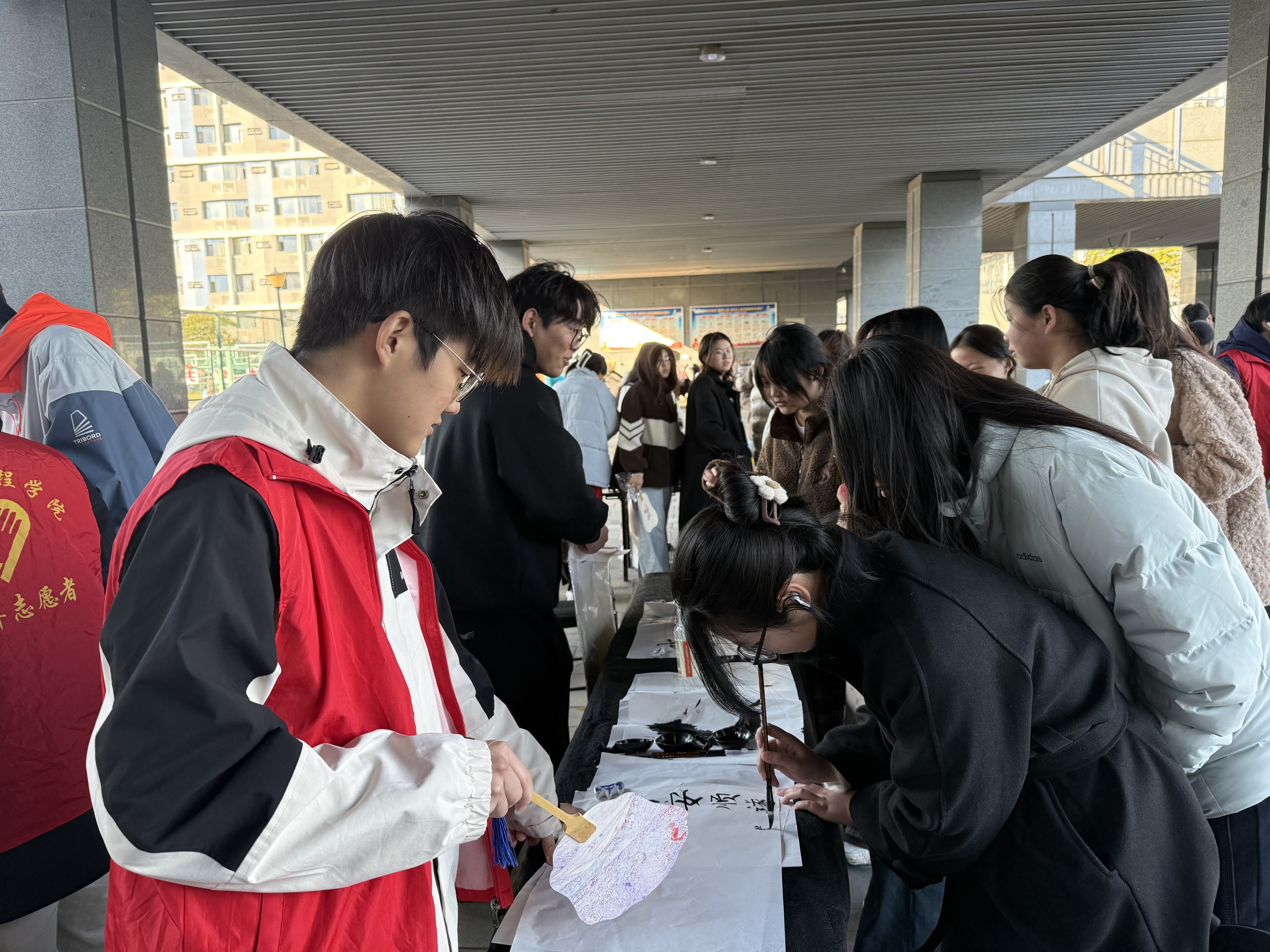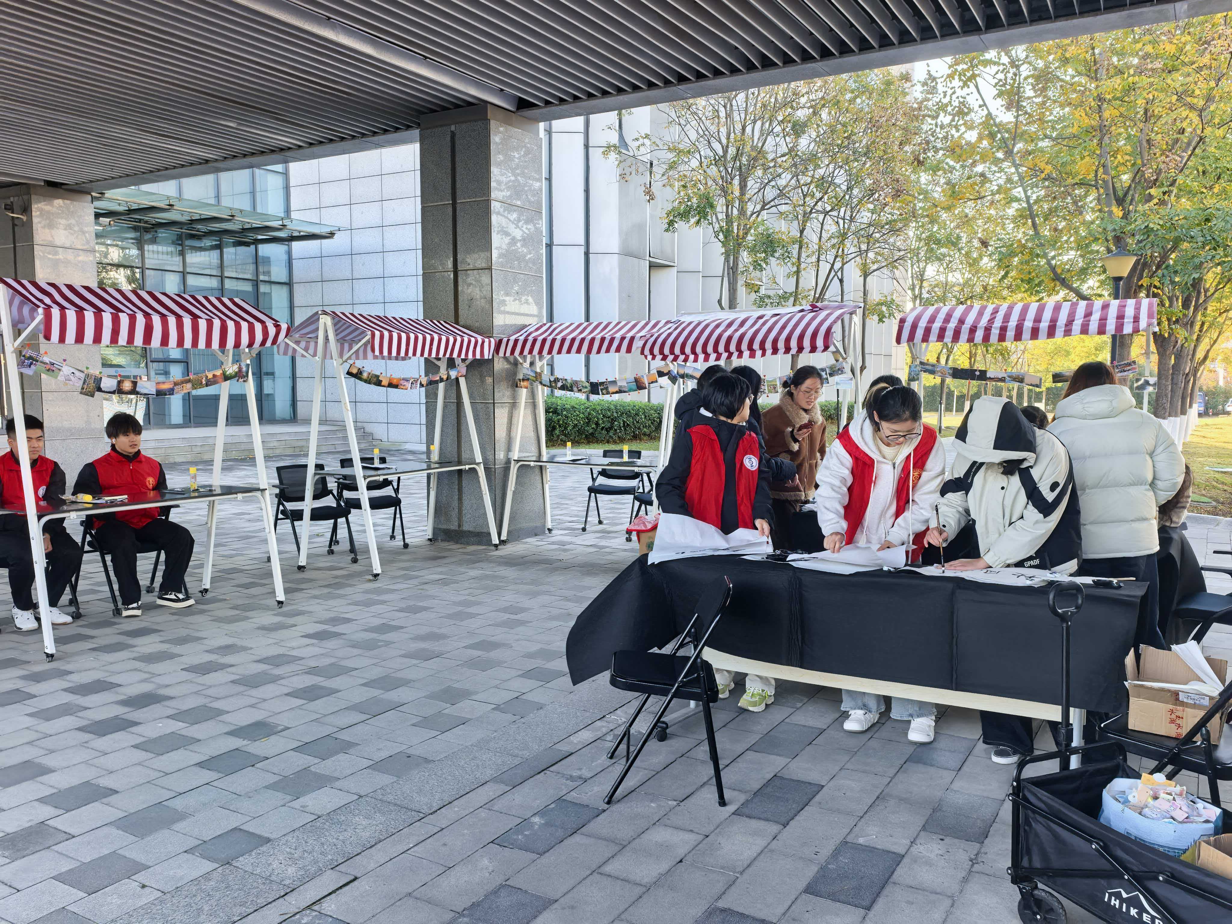 笔墨书秋意,纸笺寄情思。书法体验区则将传统文化与秋日主题巧妙融合。同学们执笔蘸墨,在宣纸上认真书写与秋天相关的诗句、词语,或刚劲有力,或清秀婉转,每一笔都凝聚着专注与情感。活动现场墨香四溢,氛围宁静而庄重。完成作品的同学还可获得定制书签、明信片等小礼品,既激发了大家的参与热情,也让书法艺术在轻松愉悦的氛围中得以传承与弘扬。