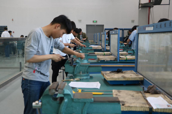 实训中心简介:主要设备包括机械装配技能综合实训平台六套,双面四工位钳工技能实训平台十二套,便携式机械系统创意组合设计实训台一套,机构运动简图的测绘及分析实验模型一套以及工业台钻、立钻、砂轮除尘机等等。