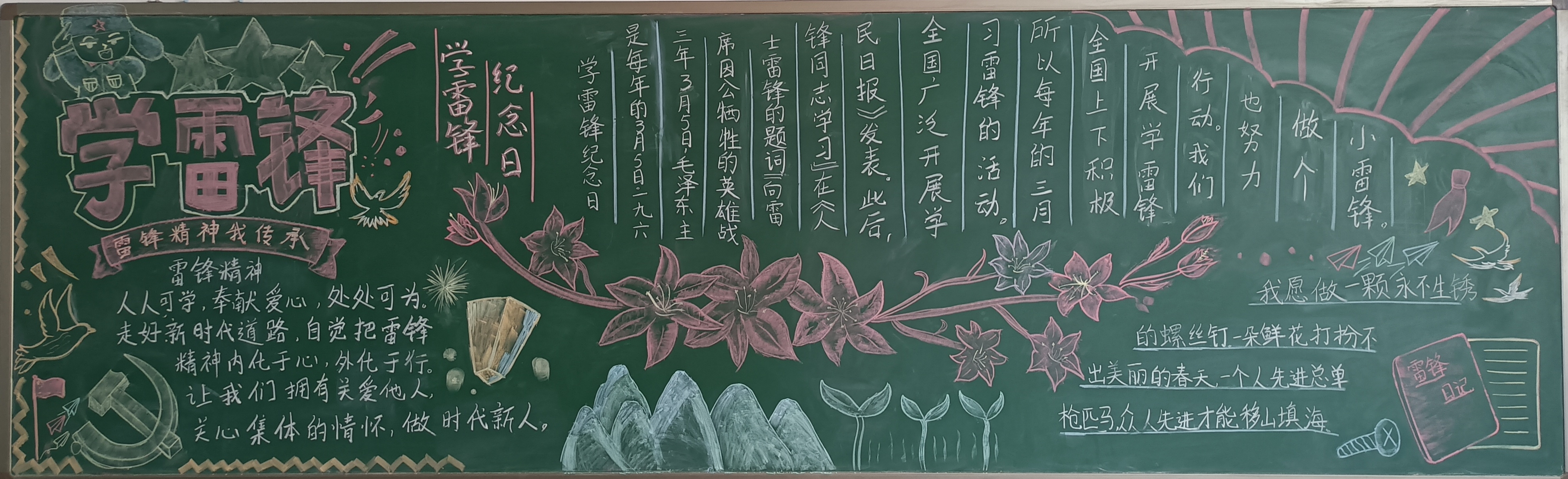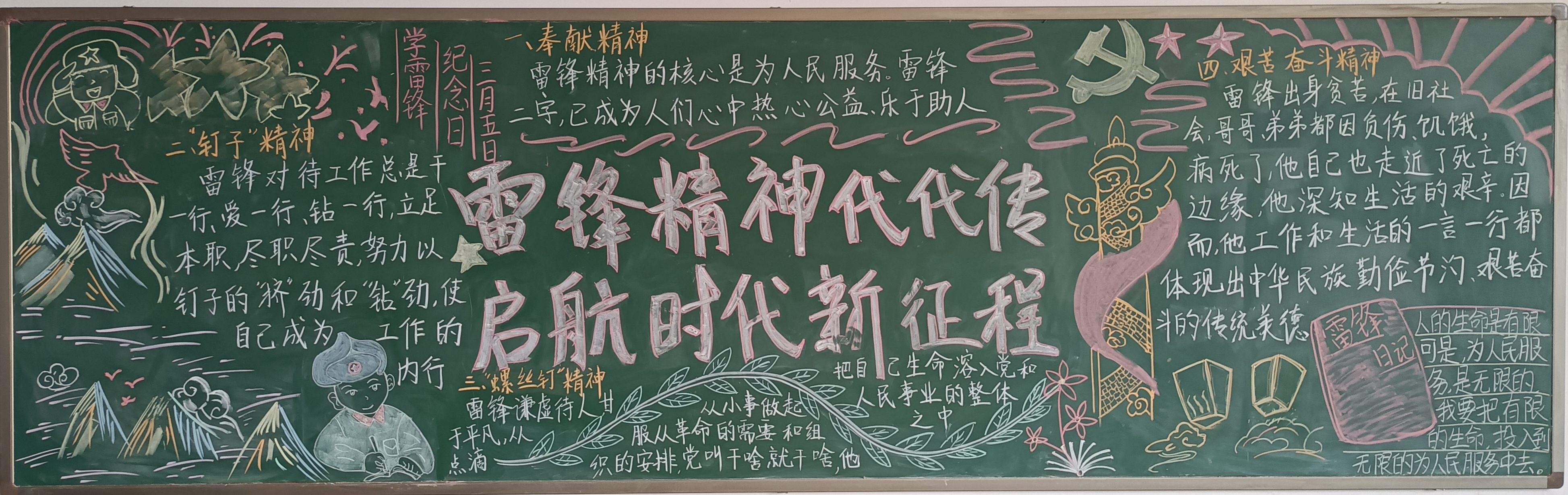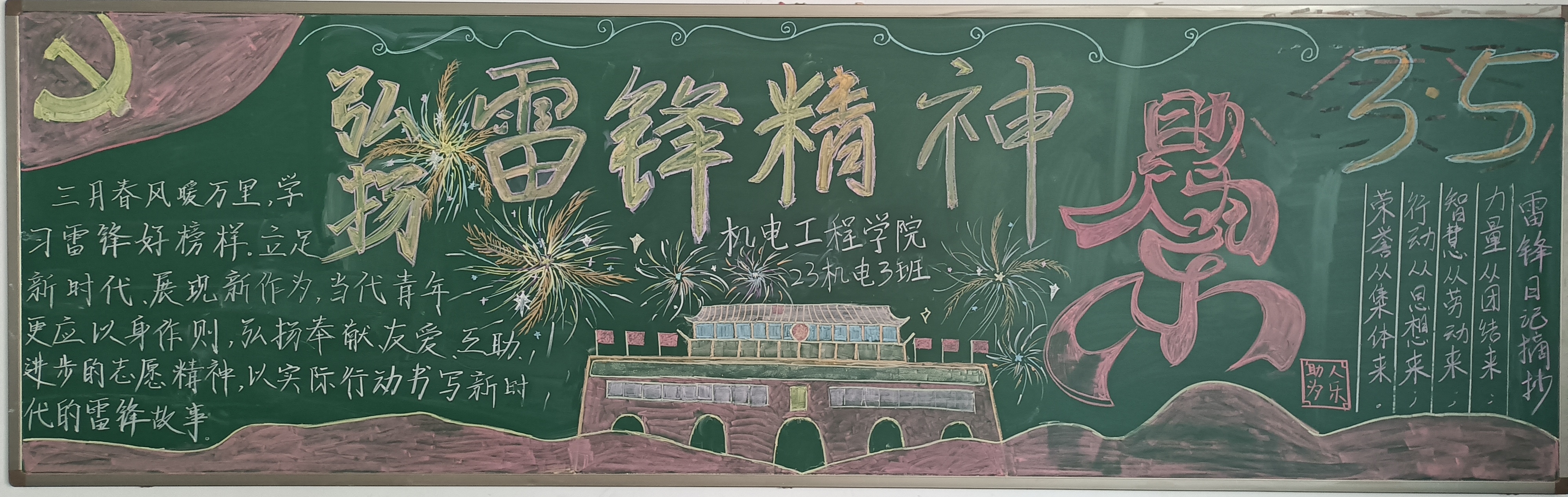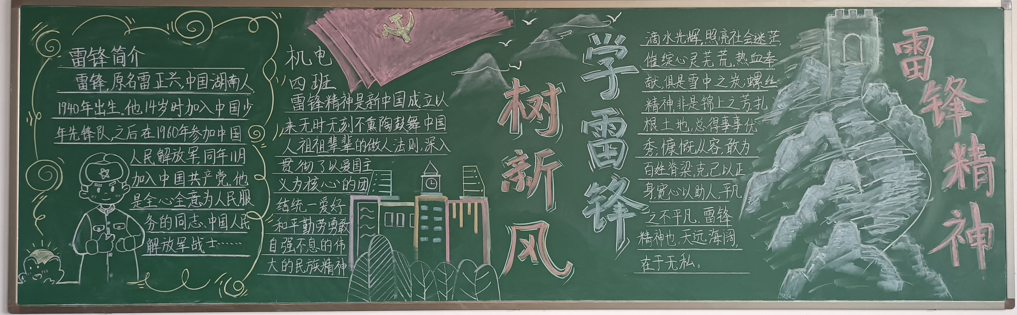 在活动过程中,各班同学群策群力、精心设计,把对雷锋的敬仰之情,都融入一块块美观大方、主题突出、图文并茂、创意新颖的黑板报里,员工的心灵再一次被雷锋的“钉子精神”,“全心全意为人民服务”等品质洗礼。经过最后的评比,23机械2班获得一等奖;23机电4班、23储能班获得二等奖;23机械3班、23焊接1班、23智控班获得三等奖。
