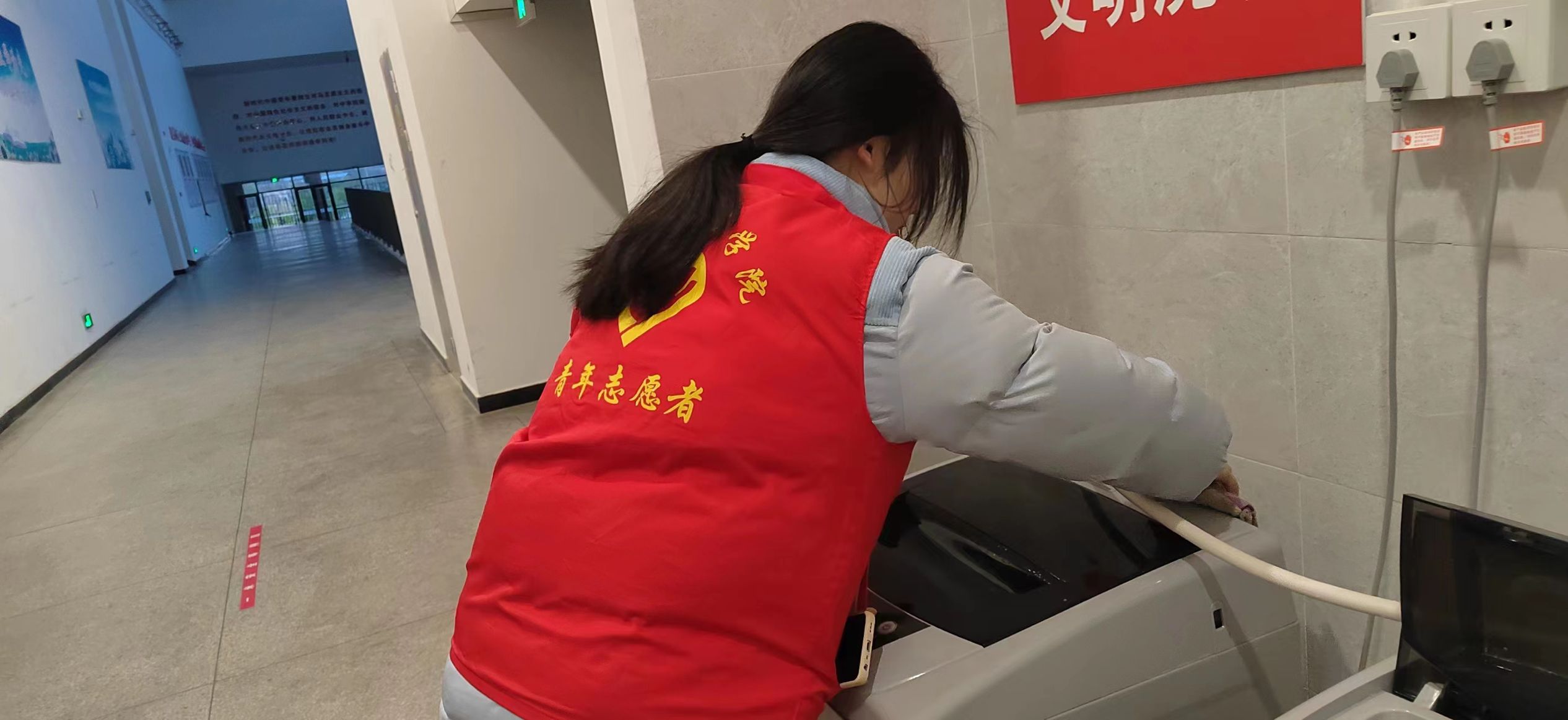 志愿者们到达活动地点后,分工明确,配合默契。首先一部分志愿者在教学南楼五楼的走廊、教室清扫灰尘、擦拭窗户、捡拾垃圾,努力做到黑板不留印,教室不留灰,座椅不留字。另一部分志愿者则来到教学北楼,他们拿着提前准备的毛巾、清洁剂等工具开始对校园公共洗衣机进行清理。清理几台洗衣机的工作量看起来不是很大,但由于死角较多,顽固残留污渍难以消除,劳动量也不小。其中,排污管道长时间没有系统清理,拆开后不仅异味难忍,而且残存的毛发、污垢等都需要耐心用手一点点清理。但是志愿者们没有放弃,他们不仅清洗了洗衣机内部,还认真擦洗了洗衣机机身。