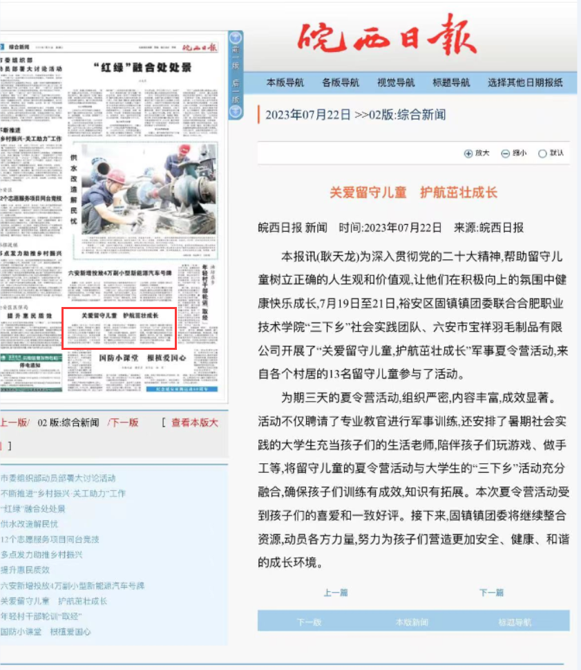 本次韦德1946体育官方入口暑期社会实践成效显著,活动过程中受到皖西日报、裕安区共青团委等当地主流媒体的广泛关注和报道,引起社会良好的反响。团队成员们也受益匪浅,大家表示:这次实践旅程不仅是一场脚踏实地的“劳动课程”,也是一场提升自我的“人生课程”,更是一场学习贯彻习近平新时代中国特色社会主义思想和党的二十大精神的“必修课程”。