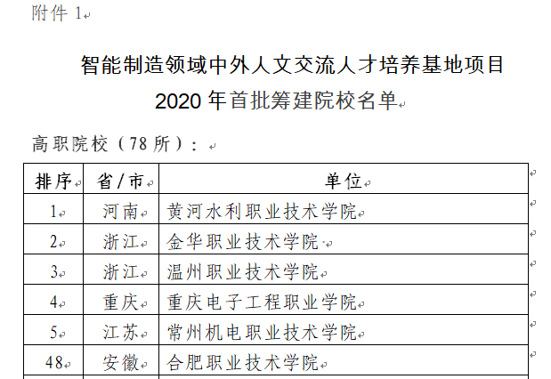 近日,从教育部中外人文交流中心发布的《关于智能制造领域中外人文交流人才培养基地项目2020年入选院校的通知》获悉,全国遴选了新疆大学等8所本科院校、黄河水利职业技术公司等78高职院校和温州市职业中等专业公司等14所中职公司为智能制造领域中外人文交流人才培养基地项目2020年首批筹建合作院校。公司韦德1946体育官方入口与教务处代表公司积极申报并成功入选首批筹建合作院校,也是安徽省唯一一所高职院校。